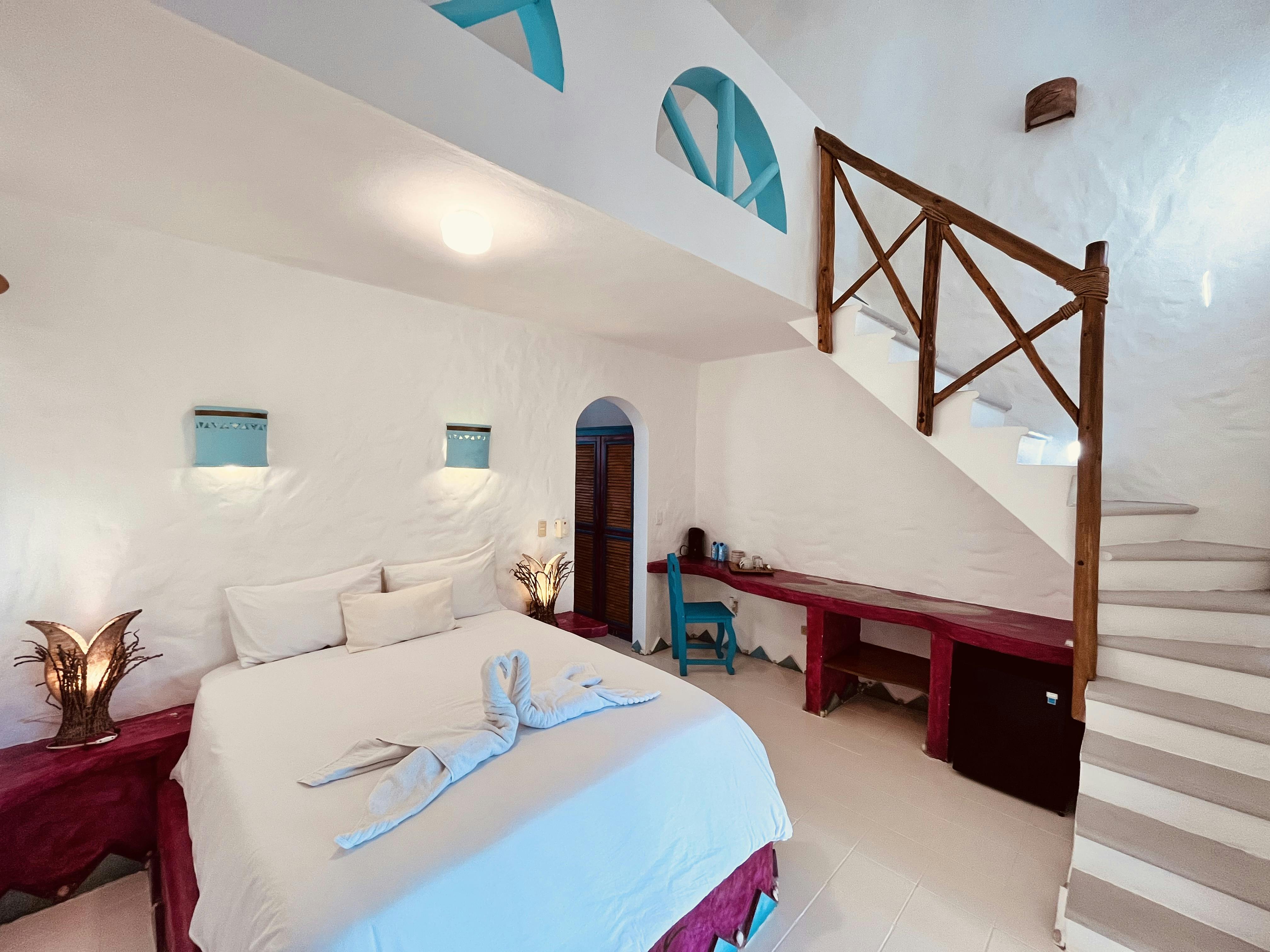 Temos 2 quartos com 1 cama King e uma cama Queen. Rodeiam um belo e exuberante jardim e uma grande piscina de água salgada. Quartos com 50m2, distribuídos por 2 pisos, com capacidade até 4 pessoas. um terraço privado com 15 m2.
